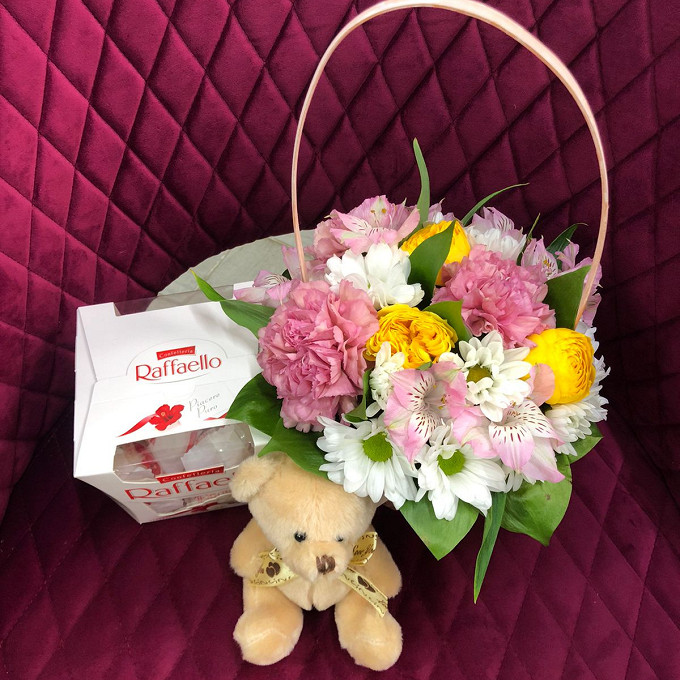 Альстромерия (нежно-розовый) — 1, рускус — 3, хризантема кустовая бакарди — 1, роза кустовая — 1, диантус — 3, корзина — 1, пиафлор / оазис/ флор. губка — 1, raffaello коробка — 1, мишка мал — 1